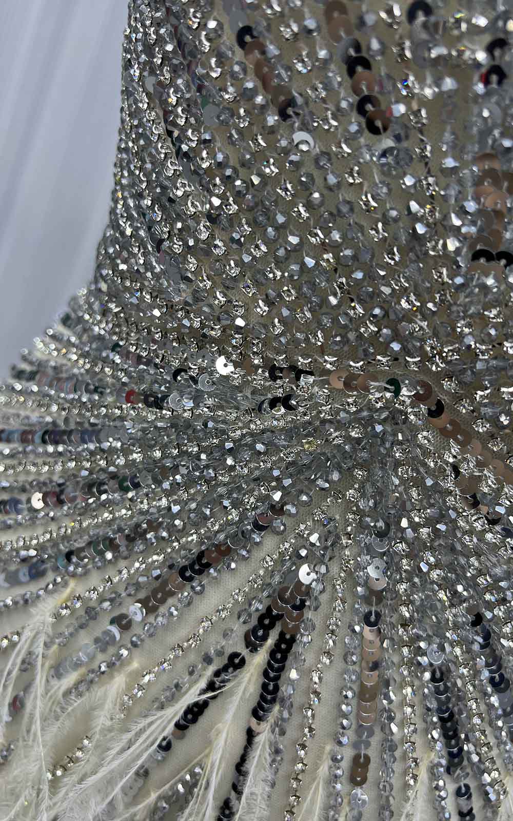 YQLNNE 0129 Silver Feathers Short Evening Dress Crystals Beaded Party Gown