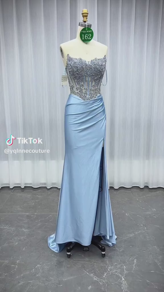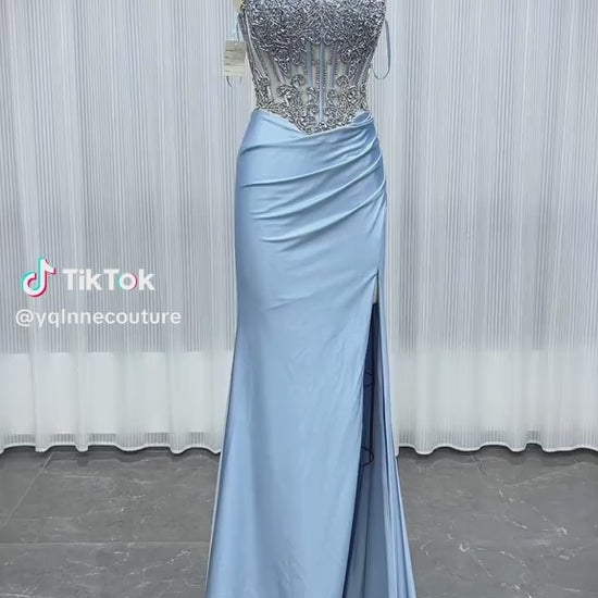 YQLNNE 0162 Blue Crystals Long Slit Prom Dress Satin Formal Gowns