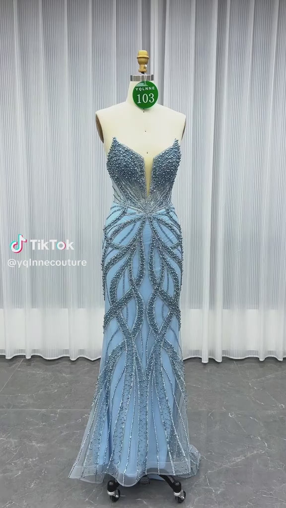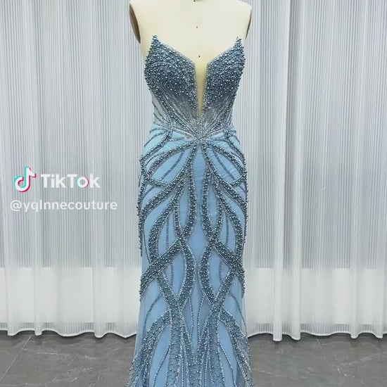 YQLNNE 0103 Blue Strapless Crystals Pearls Prom Dress Long Party Gown