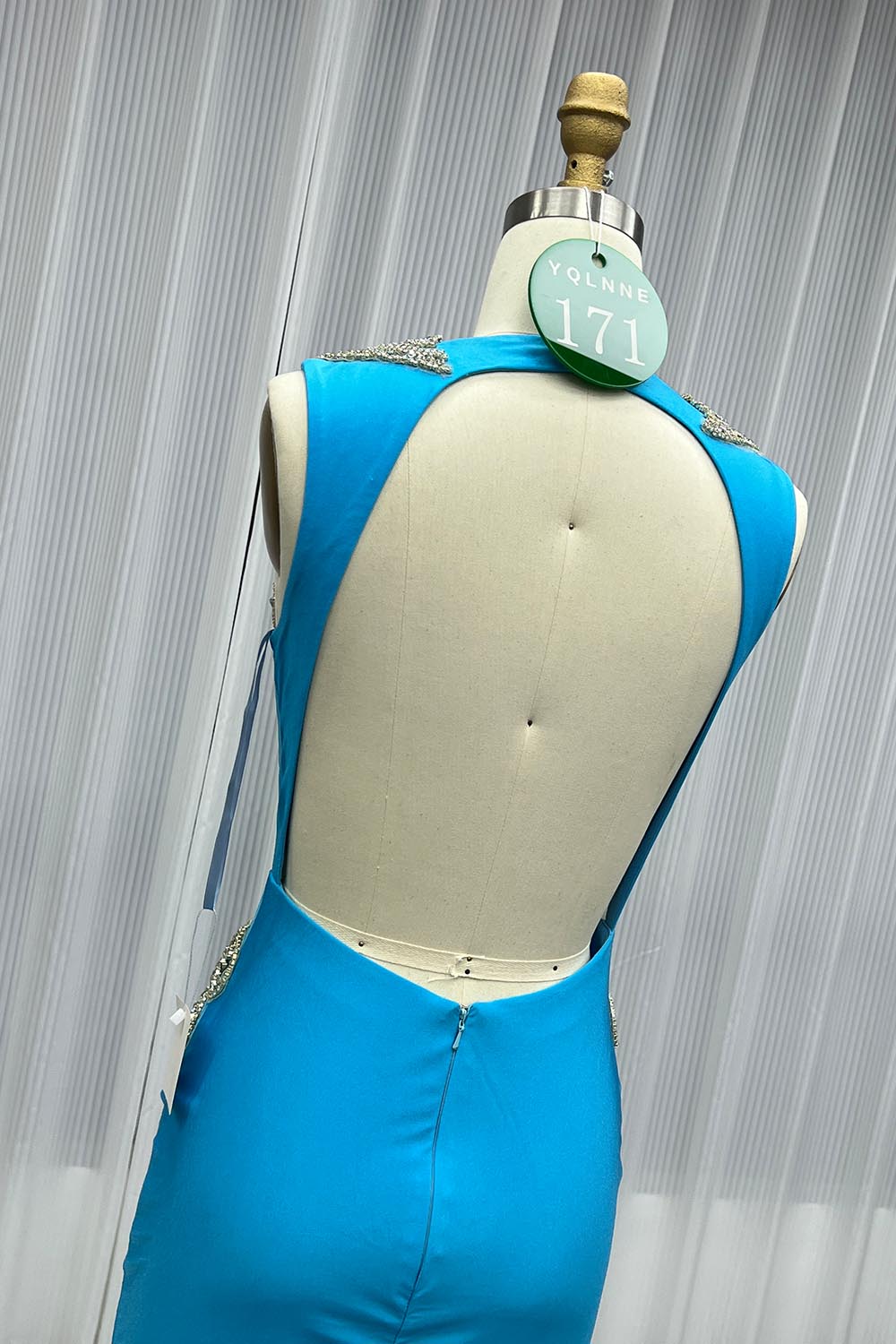 YQLNNE 0171 Blue Crystals Beaded Long Mermaid Prom Dress Backless
