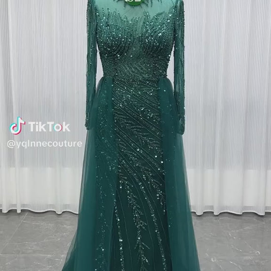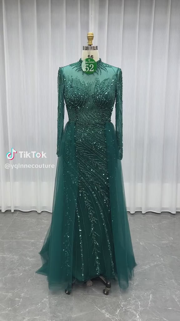YQLNNE 052 Modest Dark Green Full Sleeves Evening Dress Handmade Beaded With Removable Train