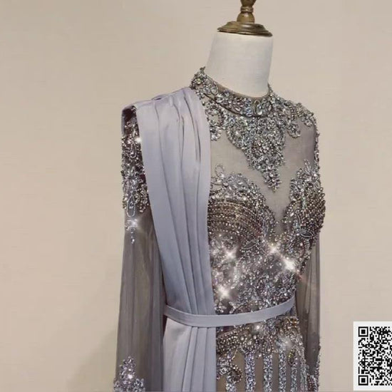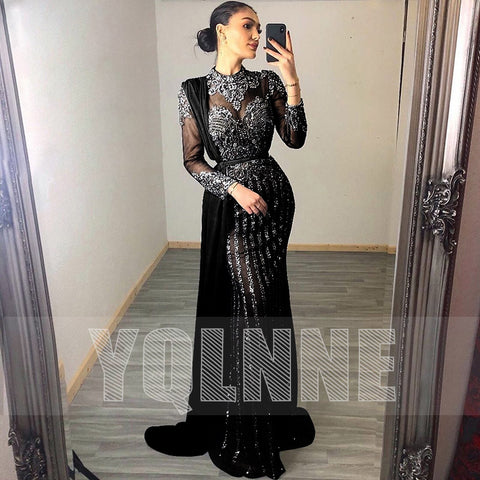 YQLNNECouture Muslim Rhinestones Evening Dresses High Neck Dubai Long Sleeve Mermaid Evening Gown Women Party Dress
