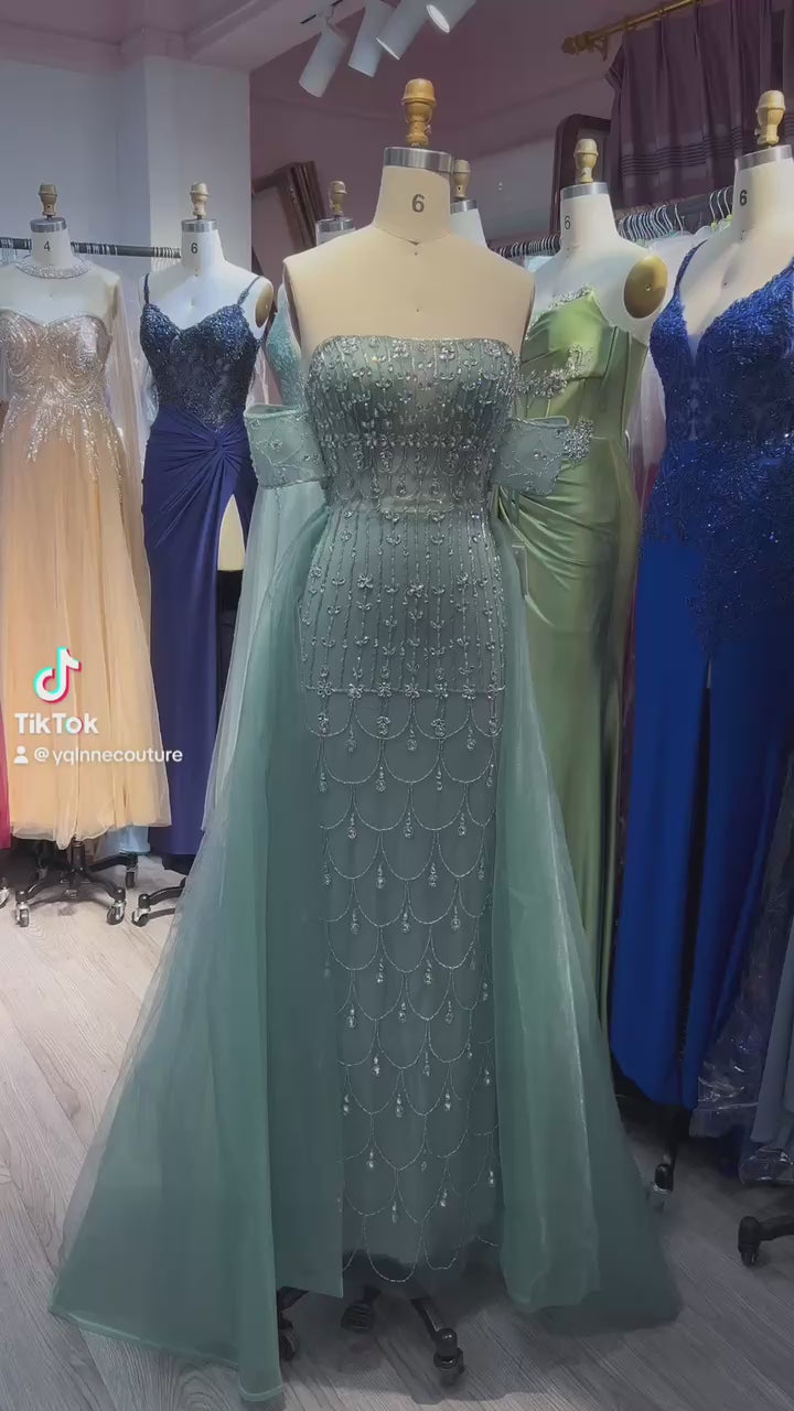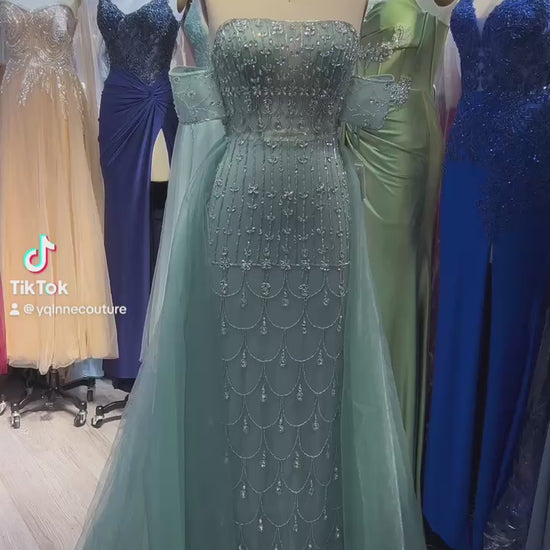 YQLNNE 5019 Sage Green Off Shoulder Evening Dress Crystals Beaded With Removable Train