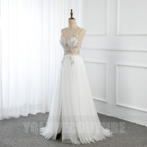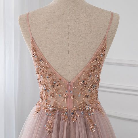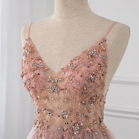 Sweet Dusty Pink Crystal Prom Dresses Long Straps Spaghetti See Through Tulle Evening Gown Slit Right YQLNNE